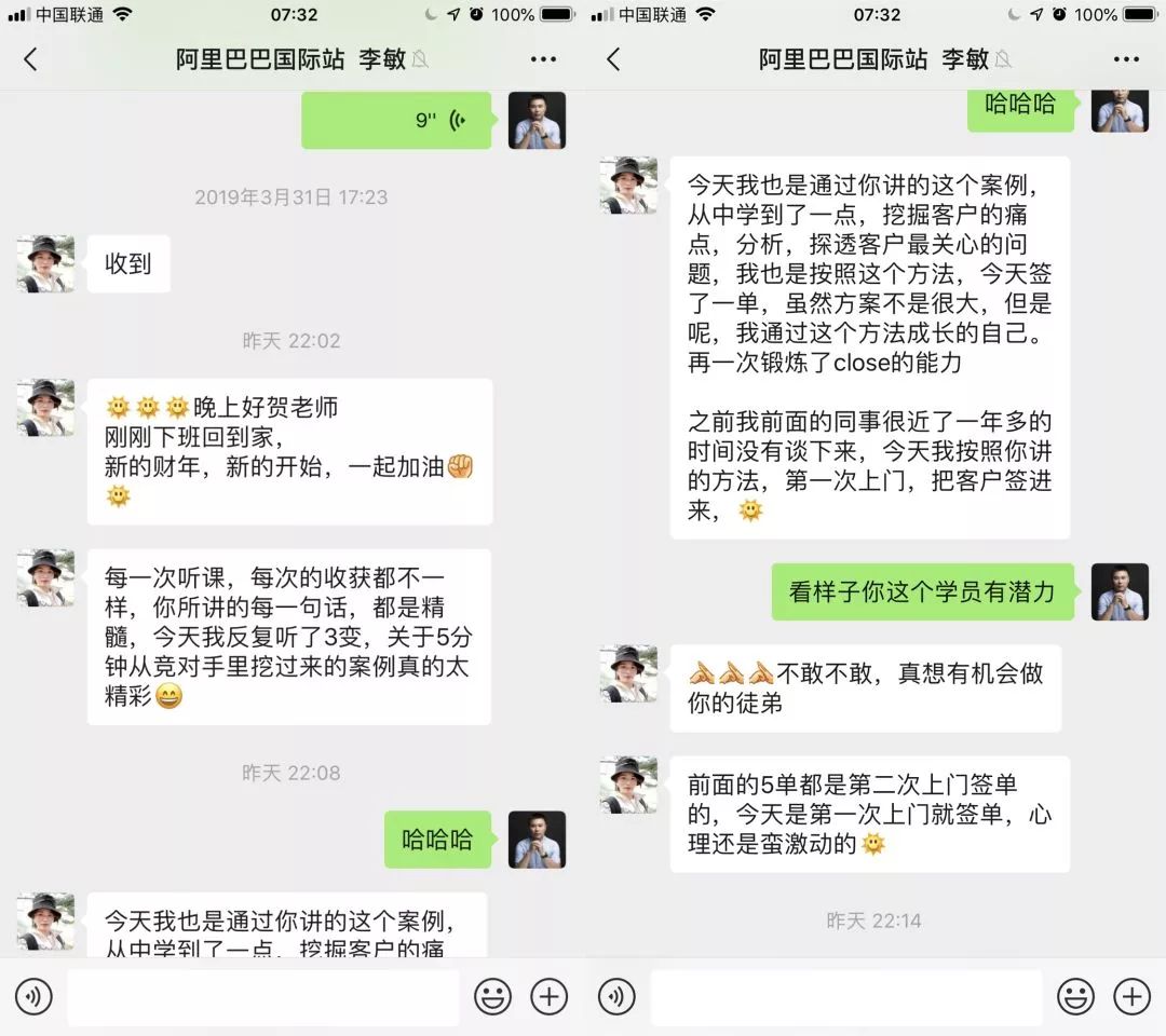 李敏说:“我亲身实践过贺老师的课程非常见效,能学到阿里中供铁军战神的销售精髓,就够了,不需要再找别的老师学习了。”