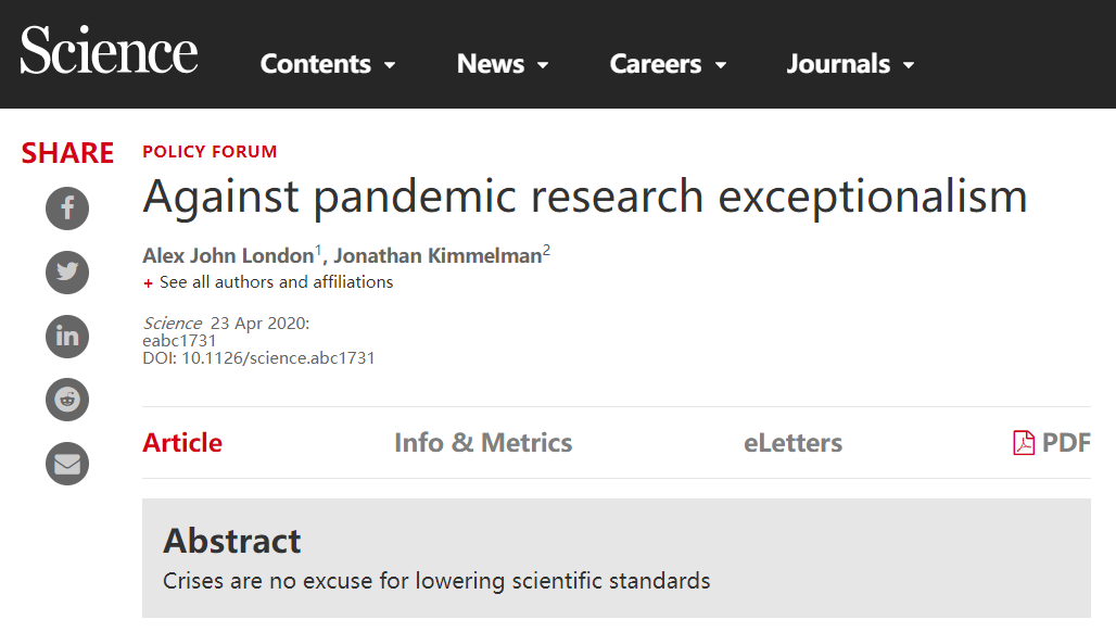 4 月 23 日,卡内基梅隆大学道德与政策中心主任、Clara L. West 的伦理学与哲学教授 Alex John London 和麦吉尔大学生物医学伦理部教授兼主任 Jonathan Kimmelman 在 Science 杂志网站发表文章,他们呼吁全球研究界,不应以当前 COVID-19 疫情爆发的紧迫性为理由,在病毒研究和疫苗研发等方面降低科研标准。
