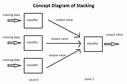 在堆叠中,组合机制是分类器(0级分类器)的输出将被用作另一个分类器(1级分类器)的训练数据,以近似相同的目标函数。基本上,让1级分类器找出合并机制。