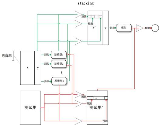 Stacking:将训练好的所有基模型对训练基进行预测,第j个基模型对第i个训练样本的预测值将作为新的训练集中第i个样本的第j个特征值,最后基于新的训练集进行训练。同理,预测的过程也要先经过所有基模型的预测形成新的测试集,最后再对测试集进行预测: