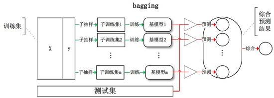 Bagging:基于数据随机重抽样的分类器构建方法。从训练集从进行子抽样组成每个基模型所需要的子训练集,对所有基模型预测的结果进行综合产生最终的预测结果 :