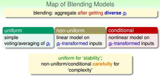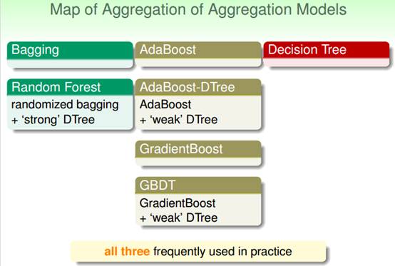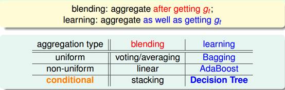 最后我们也可以按照林轩田老师课程中的讲述来对机器学习集成算法做一个归纳。集成模型主要分为两条主线,一条Blending 线,一条 Learning线。Blending 假设我们已经得到了各个基础分类器 ,learning 主要指我们面对的是一堆数据,需要一边获得基础分类器 ,同时一边学习融合它们的方法。