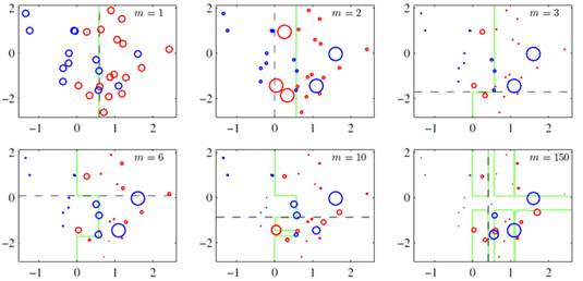 上图(图片来自prml p660)就是一个Boosting的过程,绿色的线表示目前取得的模型(模型是由前m次得到的模型合并得到的),虚线表示当前这次模型。每次分类的时候,会更关注分错的数据,上图中,红色和蓝色的点就是数据,点越大表示权重越高,看看右下角的图片,当m=150的时候,获取的模型已经几乎能够将红色和蓝色的点区分开了。