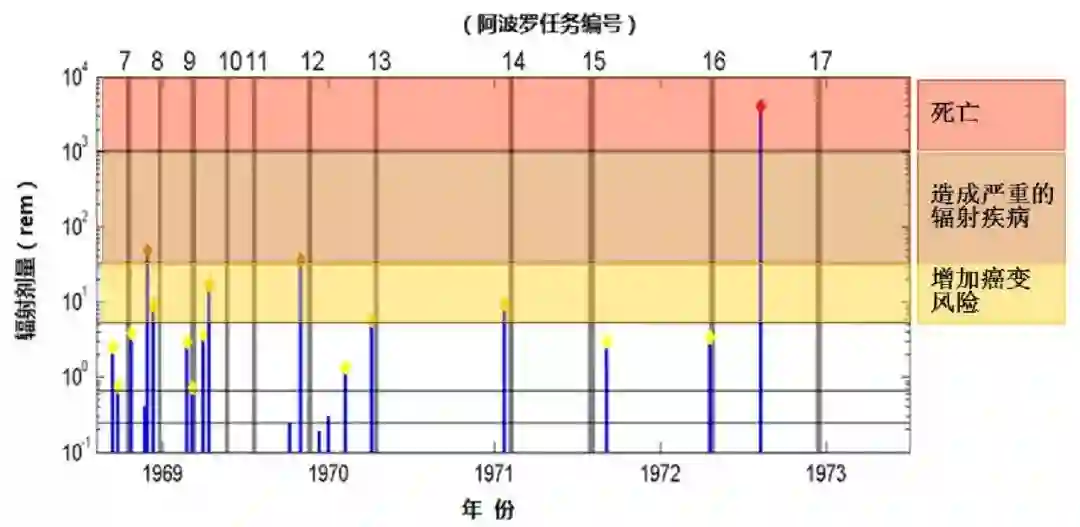 图4 阿波罗任务期发生的太阳质子事件,蓝色线条表示质子事件发生的时间,蓝色线条的长度表示这次事件可能造成的辐射剂量,灰色线条表示各任务飞行在轨时间(图片来自网络)