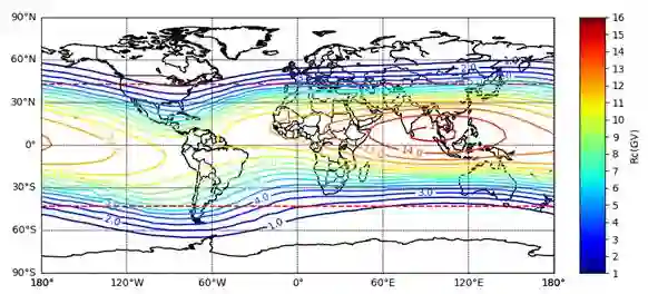图1 2015年400km高度上的地磁垂直截止刚度(Tsy89-Boberg,Dst=-300)红色虚线之间为天宫二号轨道范围