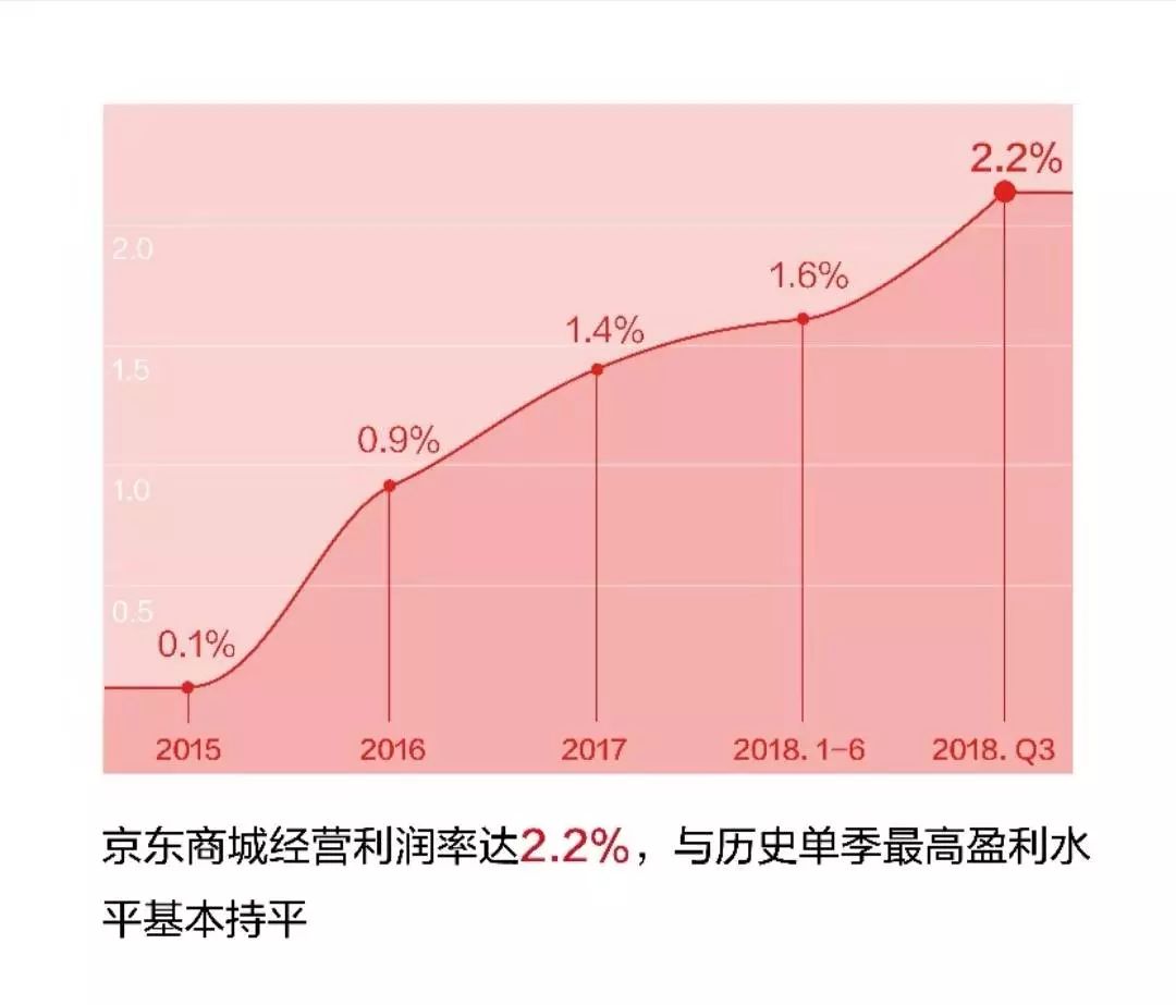 过去三年间,京东商城的经营利润率从2015年的0.1%提升到2018年第三季度的2.2%,但比起去年同期利润率稍有下降。