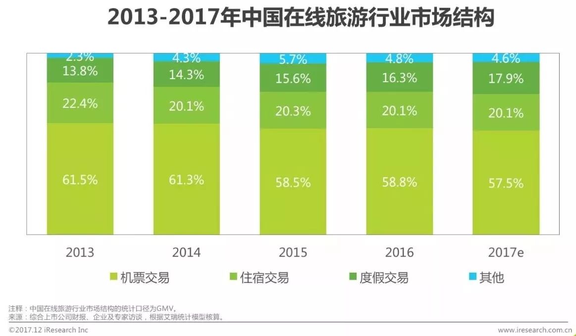 近五年来,中国在线旅游行业市场结构日趋均衡,其中机票交易占比波动下降,度假交易占比逐年上升。原因在于:一是随着中国人民生活水平的提高,消费者的旅游需求不仅仅局限在景区观光层面,而是进一步的上升到休闲度假层面;二是由于中国国内高铁动车网络的铺开及技术的发展,越来越多的消费者选择高铁动车作为出行工具,对机票交易规模产生了一定影响。