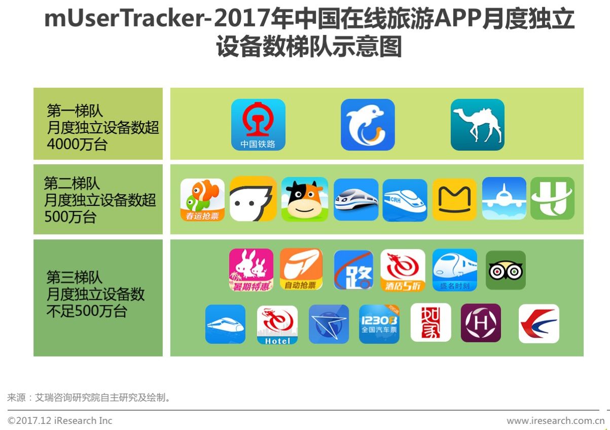 根据艾瑞mUserTracker监测数据,在线旅游市场可以月度独立设备数为指标划分为三个梯队。其中铁路12306、携程旅行以及去哪儿旅行长期占据第一梯队,月度独立设备数均超过4000万台;第二梯队主要包括途牛、同程、飞猪、高铁管家等在线旅游企业及票务预订企业,月度独立设备数超500万台;第三梯队月度独立设备数不超过500万台,主要包括驴妈妈、艺龙旅行、猫途鹰等企业。