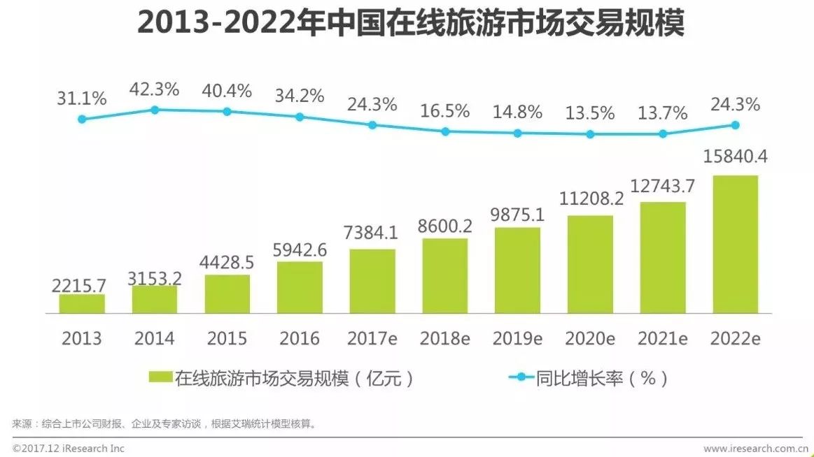 艾瑞分析,随着旅游消费者数量和消费金额的增加,以及旅游细分市场的扩张,预计2018年之后在线旅游市场交易规模将会保持平稳增长,增长幅度维持在14.0%左右,而2022年冬奥会期间将会较2021年有较大增长。
