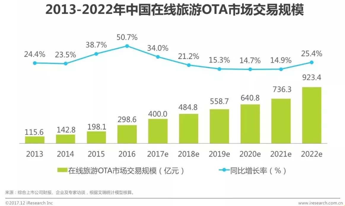 2017年中国在线旅游OTA市场交易规模为400.0亿元,较2016年增长34.0%。艾瑞分析,随着中国在线旅游OTA市场格局的逐步稳定,OTA市场交易规模将进入平稳增长的局面。