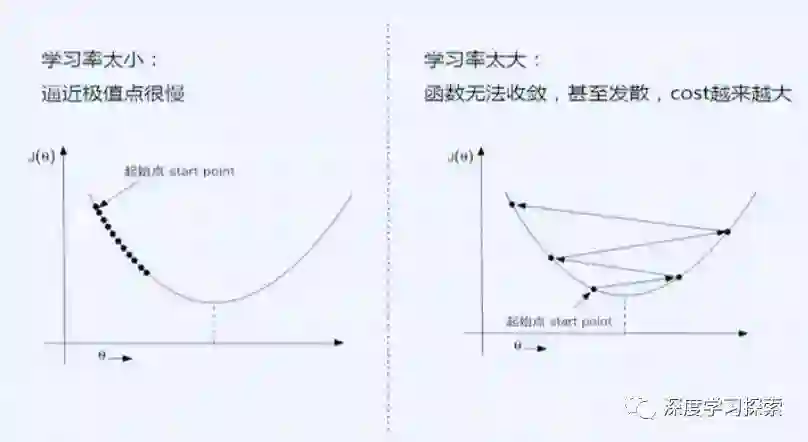 如图所知,唯一不确定的地方在于α,这个值是啥意思呢?嗯,在我们机器学习界(偷混进来的,别揭穿我),这个值叫做学习率,是人为赋值的,但如果赋值太大,则可能无法收敛(这是个知识点),如果太小,则迭代太慢(等找到最优模型的时候,已经下个世纪了,你说坑不坑)。所以,α很重要哒。