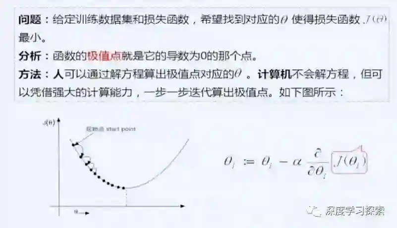 优化算法:就是求导呀,只是计算机并不会求导,它只能不断的试,近似穷举的方法找到使损失函数最小的那个值。在这里,我们称这个方法为梯度下降法。