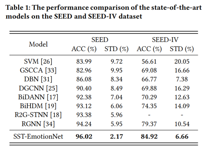 3. 在基准数据集的实验结果表明,提出的 SST-EmotionNet 优于传统的基线方法,取得了 SOTA 的性能。