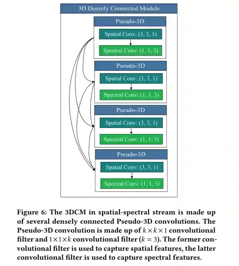 为了加强特征传播、达到更好的参数效率,受到 2D DenseNet 的启发,我们设计了一种 3D 密集连接模块(3D Densely Connected Module, 3DCM)。每个 3DCM 由若干个密集连接的伪 3D 卷积组成。频-空流中的 3DCM 结构如图所示。