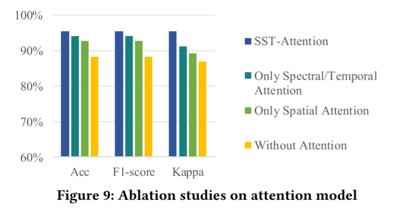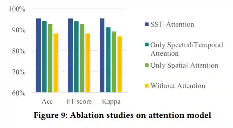 2. 空-频/时注意力机制的引入使模型更专注于对情绪识别有辨识力的时-频-空局部模式的识别,提升了分类表现。