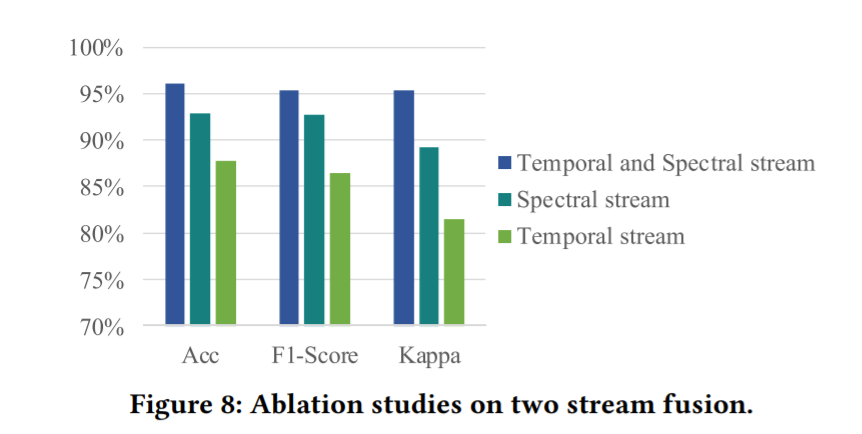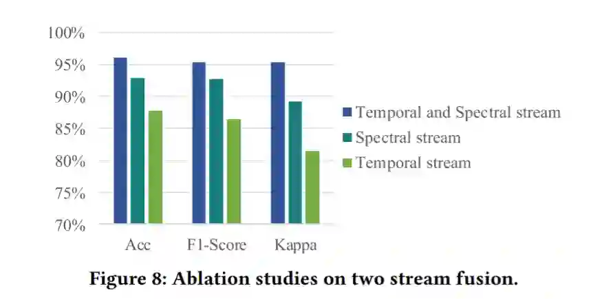 在使用双流模型的情况下,模型的准确率能够比单独使用时-空、频-空流的模型分别高出 9.48% 与 3.51%。该结果表明利用不同特征之间的互补性能够有效提高分类准确率。