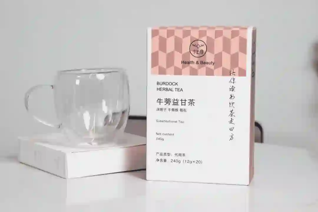 牛蒡益甘茶:决明子(30%)、牛蒡根(20%)、菊花(5%)、玄米、枸杞子、枳椇子、葛根、金银花
