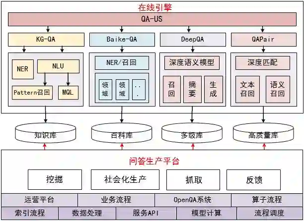 QABot引擎:包括KG-QA引擎、QAPair引擎、DeepQA引擎。KG-QA主要是百科和围绕全网知识图谱的精准问答;QAPair引擎以问答对生产消费为主;DeepQA引擎基于url索引、分类聚类、焦点词、摘要的多级系统