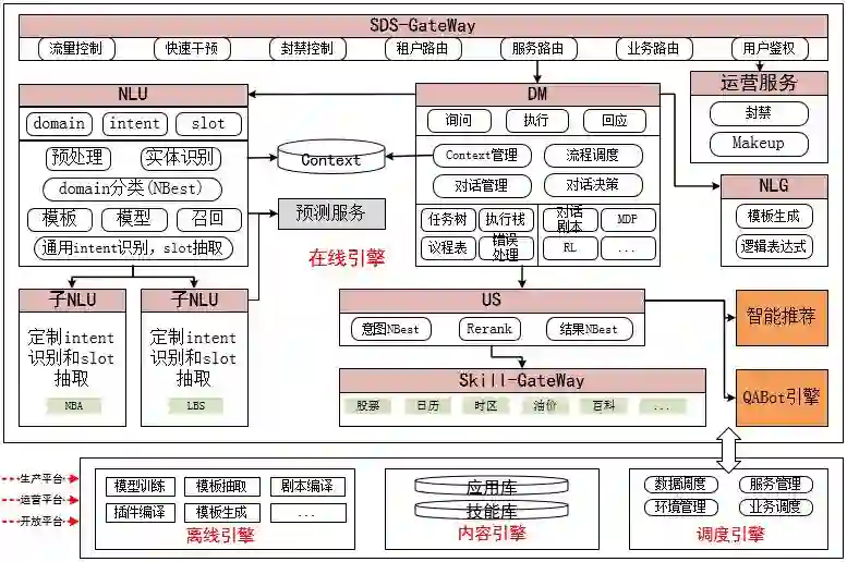 注2:大图中TaskBot引擎、QABot引擎、ChatBot引擎为逻辑架构;物理架构上QABot和ChatBot级联到TaskBot中,有多个模块进行多路召回和pk判定