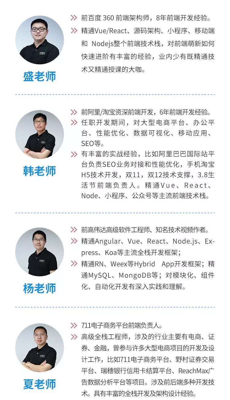 教研组充分调研了阿里、百度、滴滴、腾讯、头条、美团、蚂蚁金服这些头部互联网公司中 Web 高级工程师的开发能力模型,课程内容输出更契合当前市场主流技术和一线大厂用人标准。