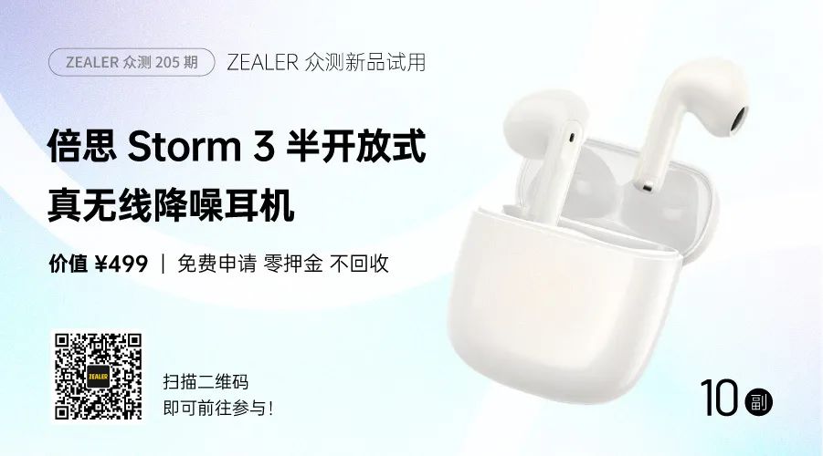 倍思小极光 Storm 3 半开放式真无线降噪耳机已上线 ZEALER 众测!主动降噪 和 半入耳式 两难全?试试倍思 Storm 3 吧!半入耳式主动降噪 + 自适应降噪技术,智能降噪不压耳;6 麦+神经网络算法通话降噪,嘈杂环境也能拾音清晰;蓝牙5.2 + 双通道低延迟技术,延迟低至 0.06 秒...扫上方二维码或戳左下角「阅读原文」即可申请免费试用。