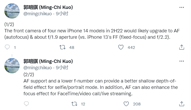 天风国际分析师郭明錤今日发文表示,苹果可能会升级其所有四款 iPhone 14 的前置摄像头,为自拍和视频通话提供更好的浅景深。苹果可能会将其 iPhone 14 型号的前置摄像头升级为自动对焦(AF),光圈约为 f/1.9,这将比 iPhone 13 上的固定焦距(FF)和 f/2.2 光圈更进一步。