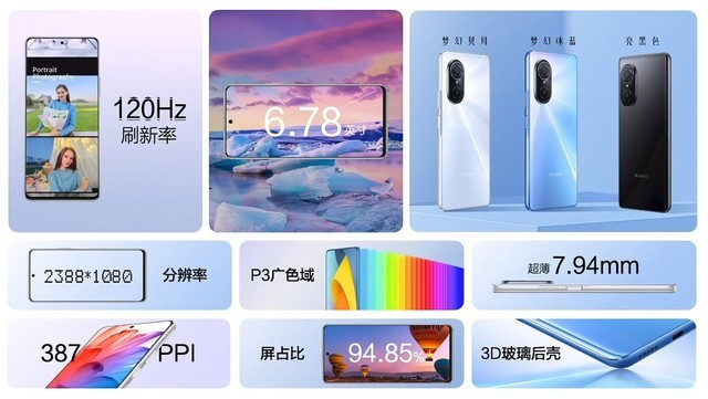 中邮昨晚正式发布了全新的 Hi nova 9 SE 智能手机,这款手机正面是 6.78 英寸的居中单挖孔 LCD 屏幕,屏占比达到 94.85%,分辨率为 2388*1080,屏幕像素密度为 387PPI,支持 P3 广色域和 120Hz 高刷新率,机身厚度为 7.94mm,采用侧面指纹解锁方案,有梦幻贝母,梦幻冰蓝和亮黑色三种配色。