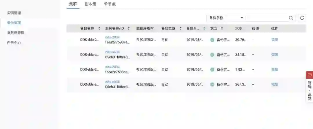 数据备份包括自动和手动两种方式。自动备份为系统自动创建的数据库实例的全量备份,手动备份是由启动的数据库实例的全量备份,且备份成功后均支持一键式恢复。