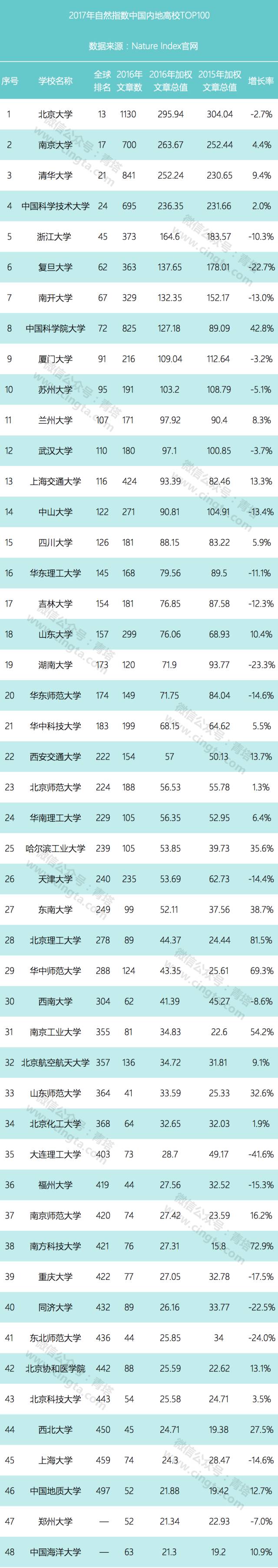 2017年自然指数综合中国内地高校排名TOP100的排名如下(中国地质大学和中国石油大学在自然指数中没有按照地区进行区分;排名按照Nature Index官网公布的结果整理):