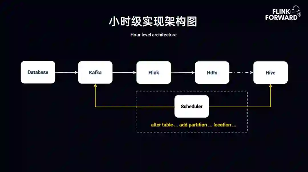 Database 中的 Binlog 抽数据到 Kafka,同时 Log server 数据也会上报到 Kafka,所有的实时数据落地到 Kafka 之后,通过 Flink 抽取到 HDFS 上。HDFS 到 Hive 之间有条虚线,即 Flink 落地到 HDFS 后,通过程序监控,Flink 在消费完成时,数据落地到 Hive 中可能是小时级的或者是半小时级的,甚至是分钟级的,此时需要知道数据的 Event time 已经到了什么时间,然后再去触发比如 alert table、add partition、 add location 等,把分区写进 Hive 中。这时还需要看一下当前的 Flink 任务的数据时间消费到了什么时间,如9点的数据要落地时,需要看一下 Kafka 里 Flink 数据消费是否到了9点,然后在 Hive 中触发分区写入。
