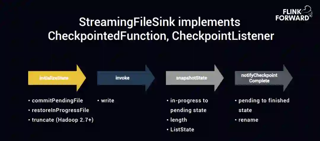 第三步 snapshotState 在触发 CheckPoint 的时候会把 in-progress 文件转成 pending state 文件,也就是开始提交文件,同时记录 length 长度。记录长度是因为前边的步骤需要 truncate 来截断多长,snapshot 时,是没有真正的写入到 HDFS,其实是写入到 ListState,等所有的 CheckPoint 算子都完成了,就把 ListState 中的数据都刷到 HDFS 中,只要数据存在 Flink 自带的 state 中,不断把数据成功的刷到 HDFS 中就行了。