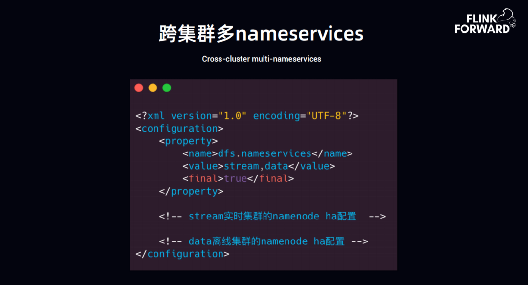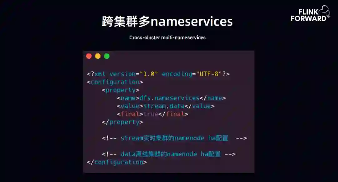 趣头条的实时集群跟离线集群是独立的,实时集群目前是一套,离线集群是有多套。通过实时集群要写入到离线集群,这样就会遇到一个问题,HDFS nameservices 问题,如果在实时集群中把所有的离线集群的 nameservice 用 namenode HA 的方式全部打入到实时集群,是不太合适的。所以使用 Flink 任务中 resource 下边把 HDFS 中的 xml 文件中间加 final 标签,设置为 true。此处的 value 标签中,stream 是一个实时集群,date 是一个离线集群,这样把两个 HA 配置在 value 标签,从而达到实时集群是实时集群,离线集群是离线集群,中间的 HDFS 中 set 不需要相互修改,直接在客户端时间就行了。