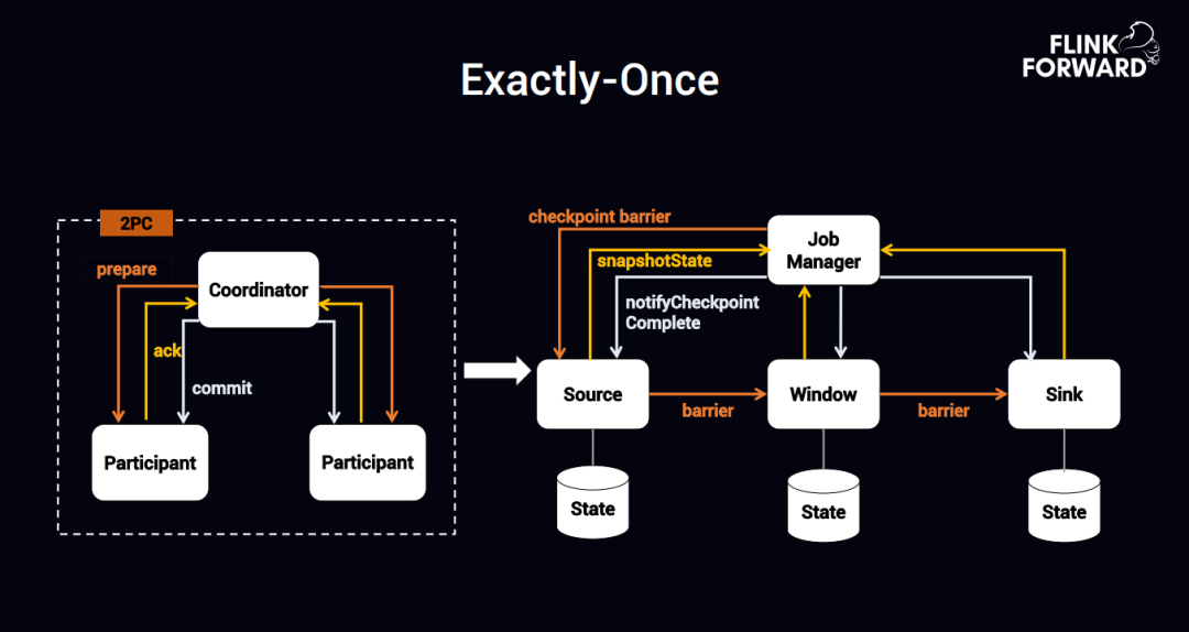 具体实现 Exactly-Once 的方式,如上图所示,左侧是一个二阶段的模型,Coordinator 发一个 perpare,所有的参与者或者执行者开始触发 ack 动作,Coordinator 收到所有人的 ack 动作后,就开始执行 commit,所有的执行者就把左右的数据进行落地。到了 Flink 这块,Source 收到了 checkpoint barrier 流的时候,开始触发 snapshorState 发送到 Job Manager,Job Manager 把所有的 CheckPoint 都完成以后,会发送一个 notifyCheckpointComplete,Flink 这块跟上图左边的二阶段提交协议是一致的,Flink 也是可以实现二阶段提交协议的。