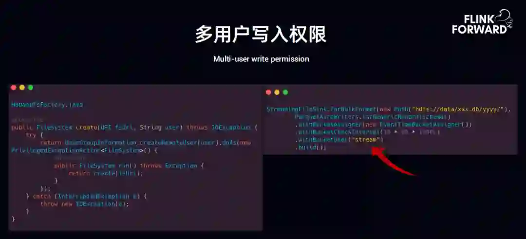 针对多用户权限写入的问题,实时写入离线 HDFS 中的时候,会涉及到用户权限。遇到用户权限时,也会有一个问题,Flink 实时提交的用户,是定义好的,所有的程序里用户是同一个,但是离线是多个用户,Flink 目前对于这块用户的权限做的还不够好,所以我们自己改造了一下,在 API 中添加了 withBucketUser,上边已经配置好了 nameServices,然后通过该参数来配置具体是那个用户来写入 HDFS 中,这是 API 层级的。