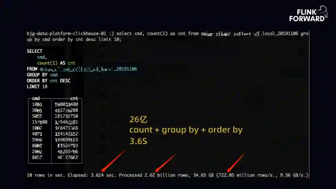 上图是处理相对较为复杂的 SQL,count+group by+order by,ClickHouse 在 3.6s内完成 26 亿数据计算。