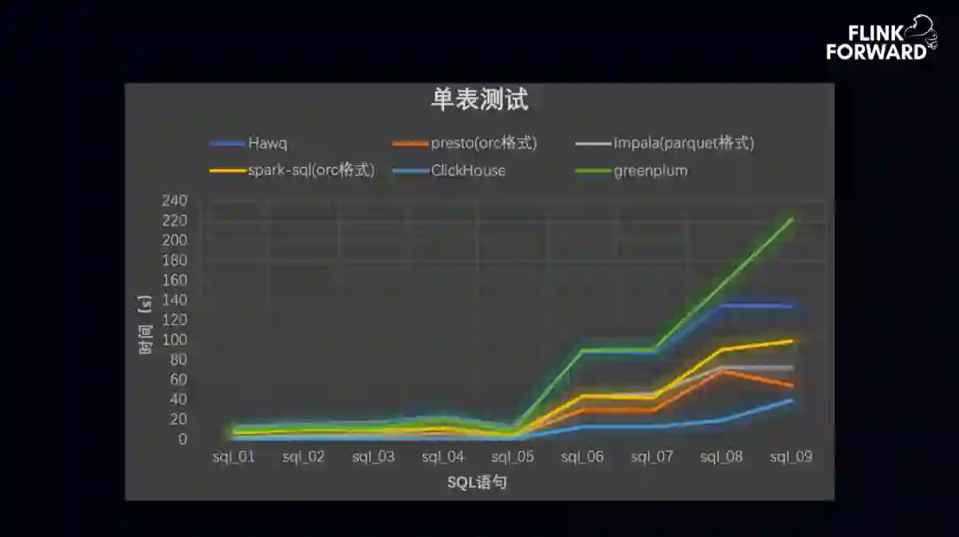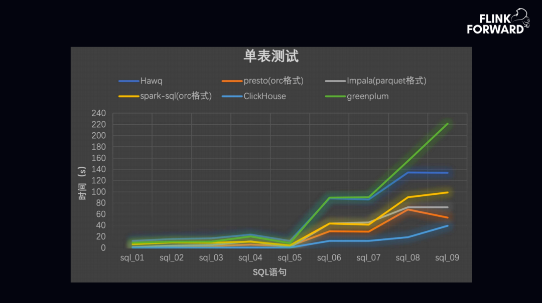上图为单表测试结果。ClickHouse 单表测试速度快。但受制于架构,ClickHouse 的 Join 较弱。