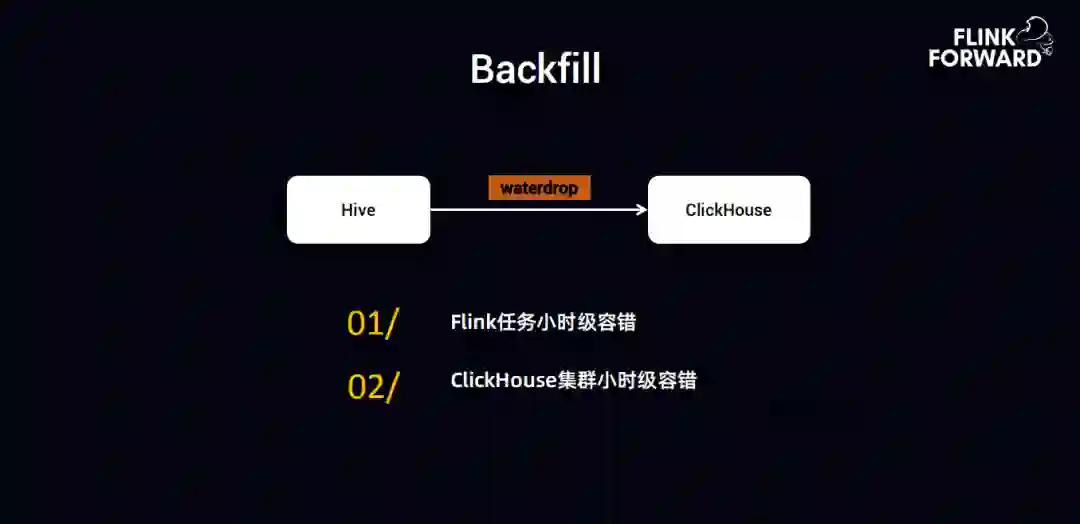 Flink 导入数据到 ClickHouse,来实现数据的查询、报表展示,会遇到一些问题。如 Flink 任务出现故障、报错、数据反压、network 的一些问题;或者 ClickHouse 集群出现了一些不可响应、ZK 跟不上等 ZK 问题;或者集群的负载问题;或者是上边提到的 insert 太快的问题;会导致整个任务都有问题。如果数据量突然暴涨,把 Flink 启动,就会出现一段时间内不停的追数据,可能就需要调大它的并行度之类的,让 Flink 任务把数据追上。但是数据已经积压了,Flink 又要加大它的并发度来处理数据,但是 ClickHouse 那块又限制了 insert 速度不能太快,所以就做了另外一个机制,也就是 Flink 故障了或者 ClickHouse 故障了,等到 ClickHouse 集群恢复之后,Flink 任务还是从最新的开始消费,过去的一段数据不再去追了,通过 Hive 来把数据导入到 ClickHouse。
