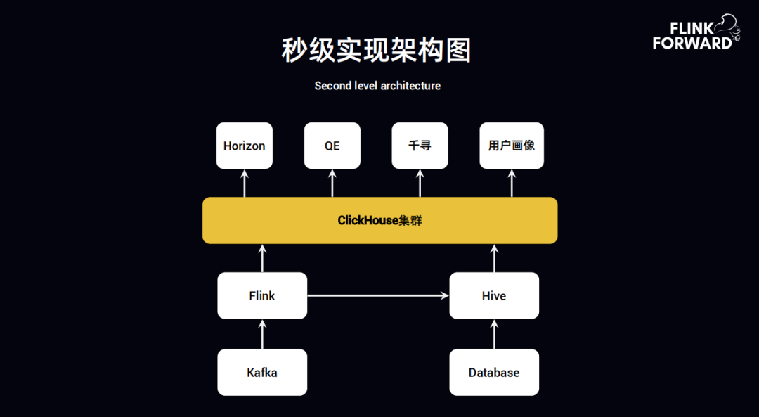 上图为秒级实现架构图,从 Kafka 到 Flink 到 Hive 然后再到 ClickHouse 集群,对接外部 Horizon ( 实时报表 )、QE ( 实时 adhoc 查询 )、千寻 ( 数据分析 )、用户画像 ( 实时的用户画像 )。