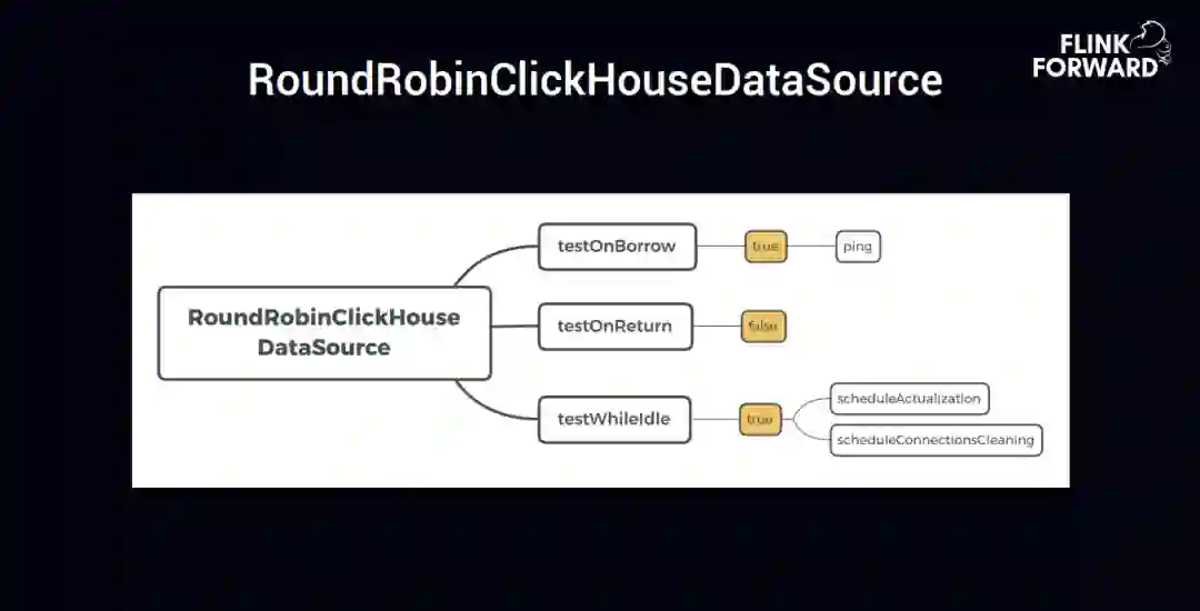 针对于官方提供的 API,趣头条对这方面做了一个加强,开发了一个 RoundRobinClickHouseDataSource,实现了三个语义,分别是 testOnBorrow、testOnReturn、testWhileldle。