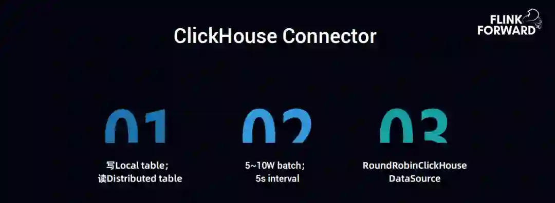 上图是 ClickHouse Connector,ClickHouse 有两个概念,local table 和 distribute table。local table 是用来写的,当然 distribute table 也可以写入,但是会出现很大的 io 问题,所以尽量不要写 distribute table。但是可以读 distribute table。5-10w 一个 batch 进行数据写入,正常的情况下,是5秒一个周期。