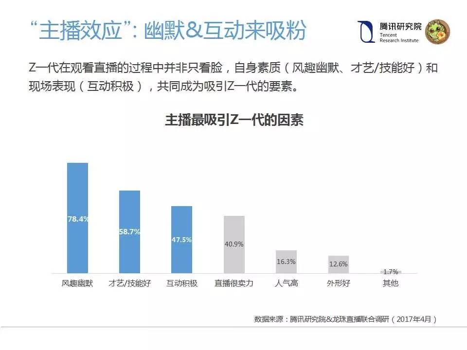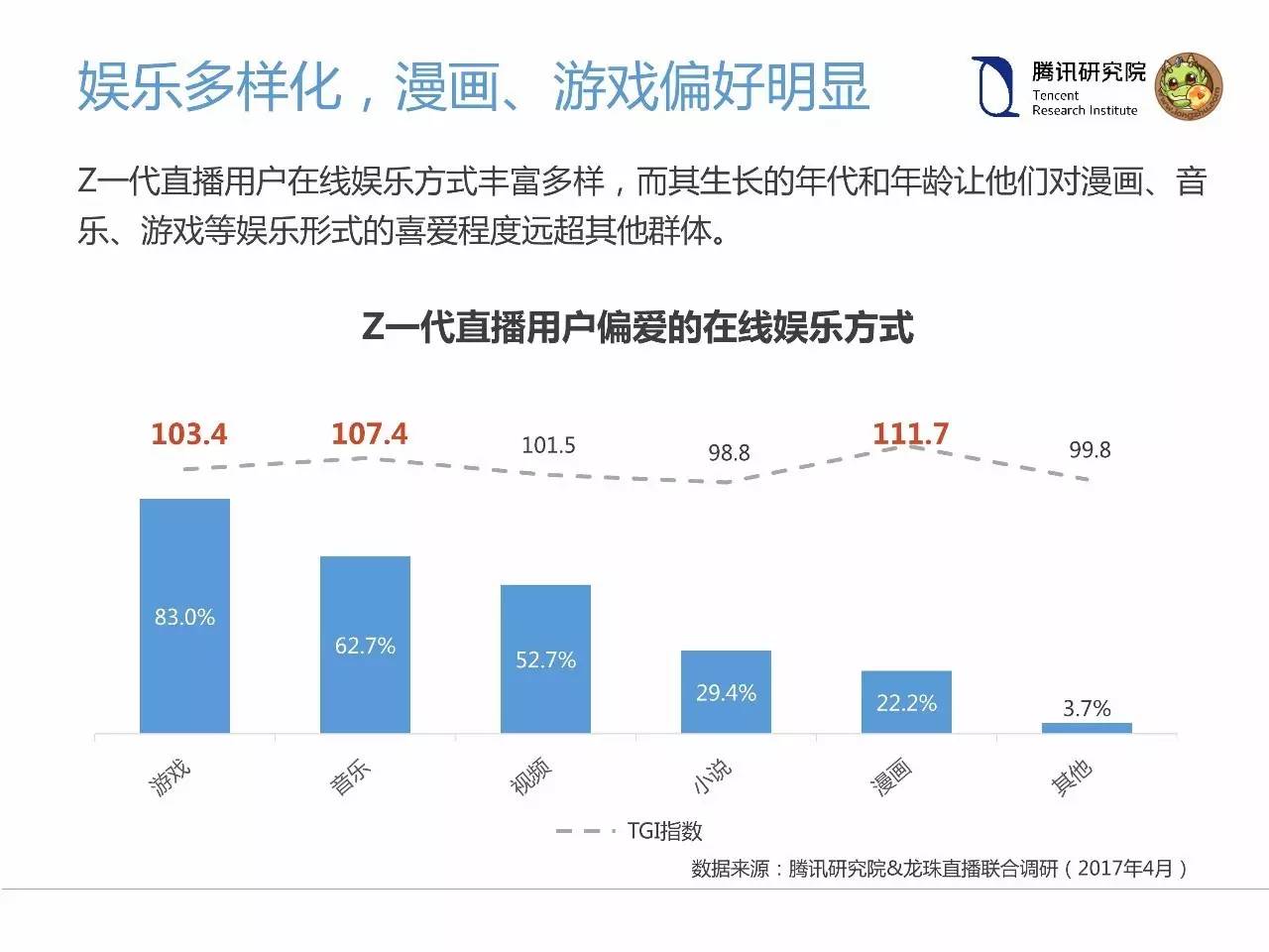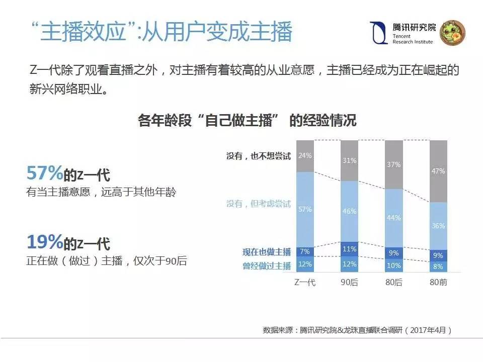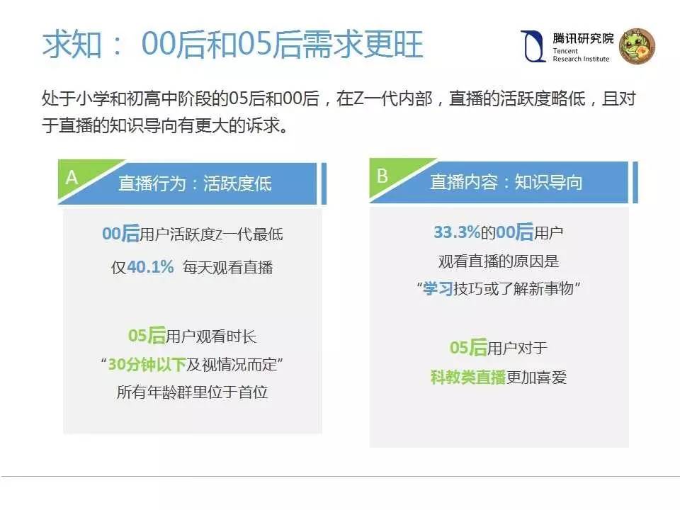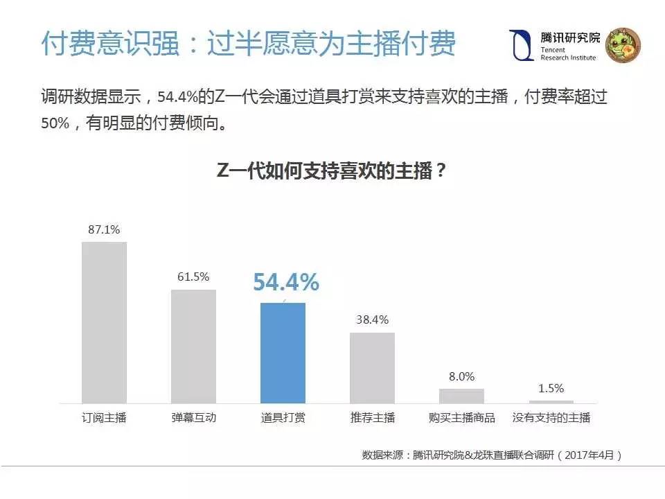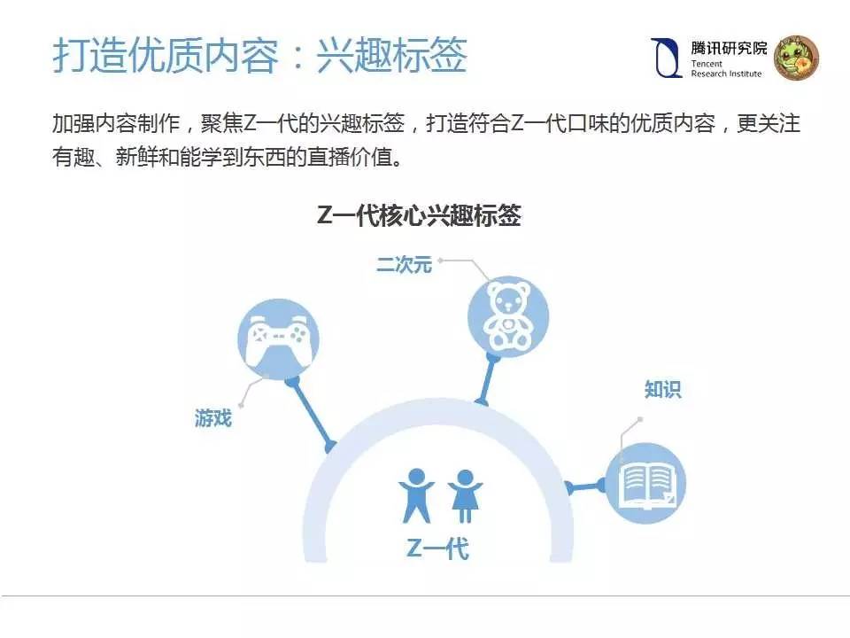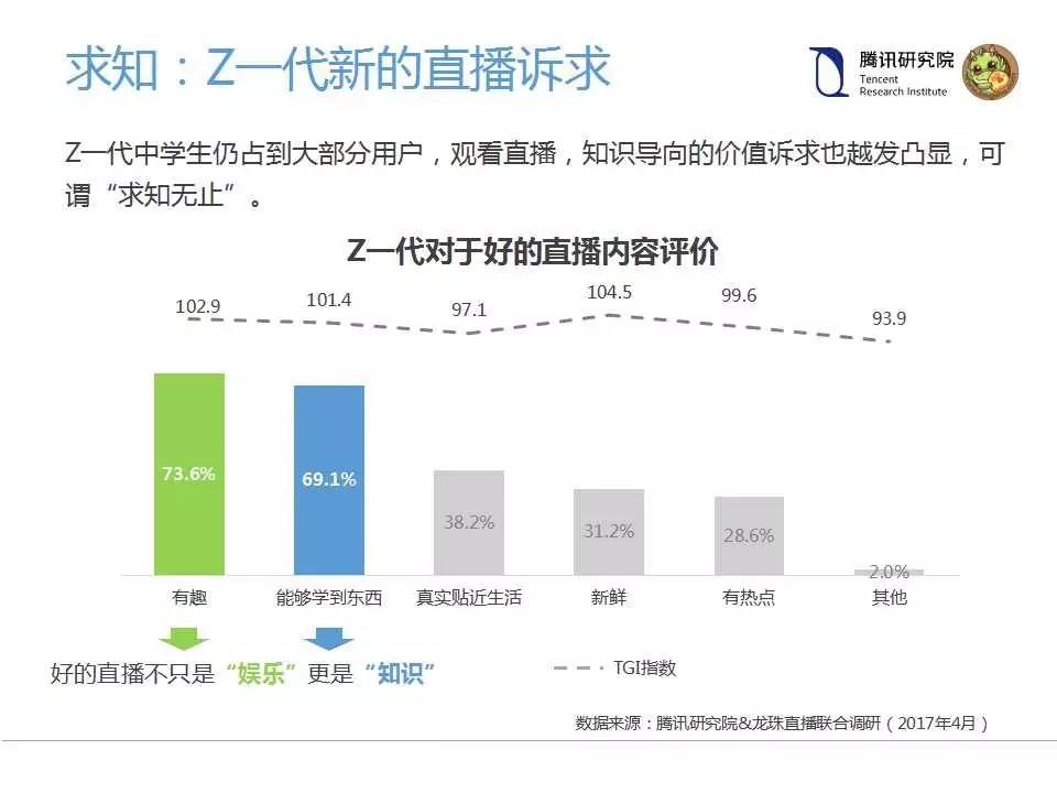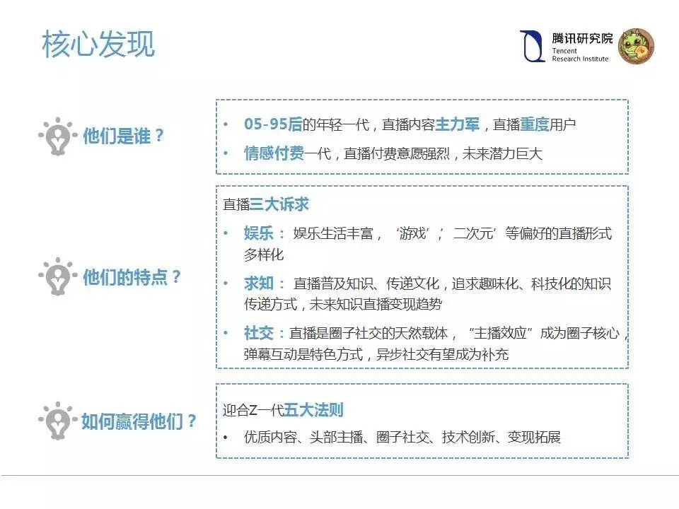 腾讯研究院联合龙珠直播,对9310名直播用户进行调查,描绘出Z一代的直播画像:直播重度用户,娱乐、求知、社交是直播的三大诉求,付费意愿强烈,未来潜力巨大等。并提出了赢得Z一代的直播五大法则。