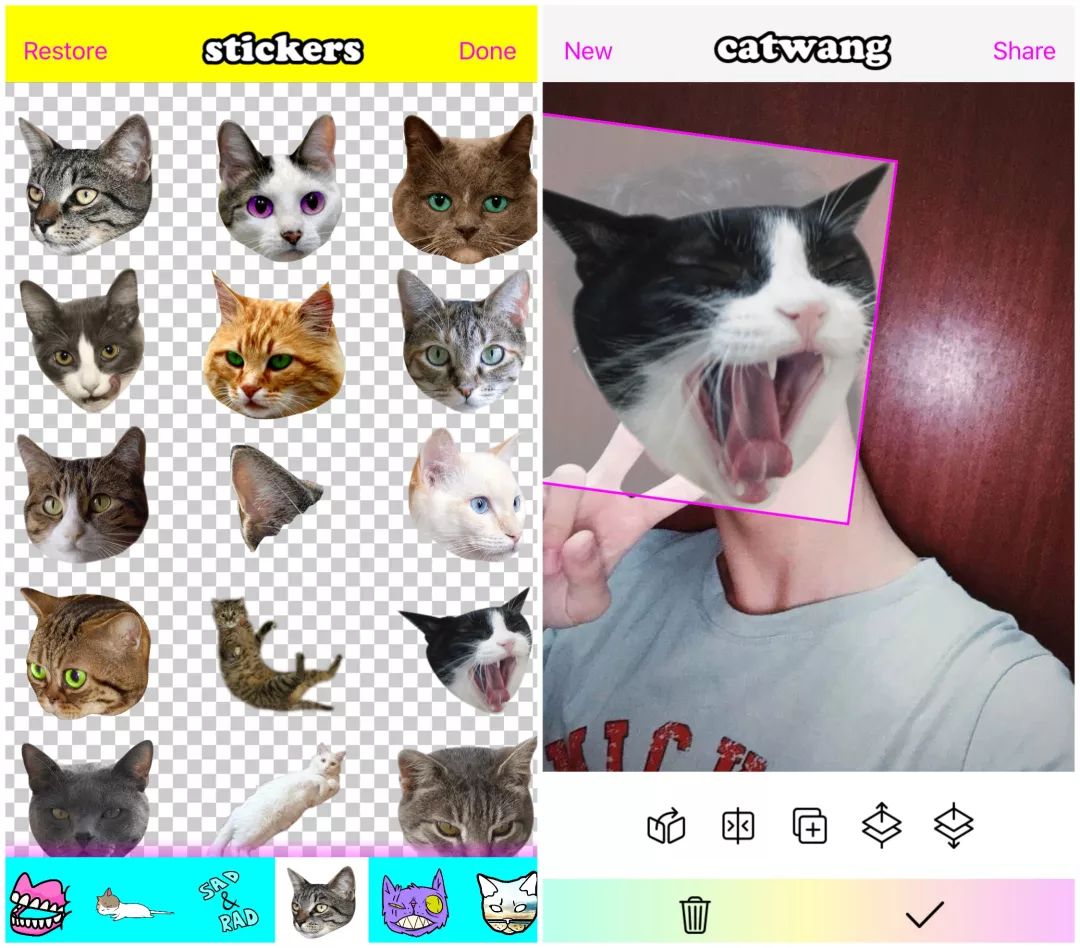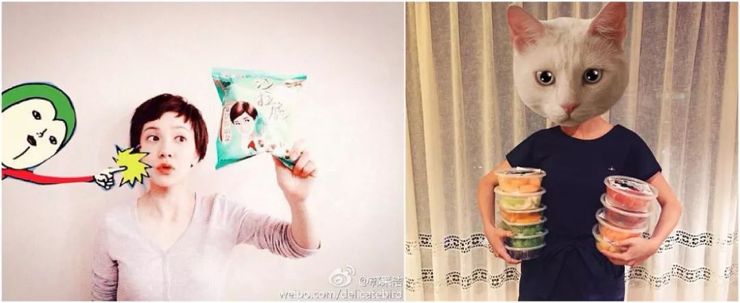 Catwang 和柏林少女就是她使用的 app,它们功能单一,专门为你的照片加上各类画风清奇的贴纸。Catwang 的贴纸偏向于搞怪风格,除了郭采洁照片中的猫头,app 内还有披萨、怪物、符号以及各类生活小物品的贴纸,非常值得玩味。