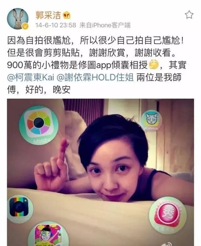 郭采洁热衷于给自己的照片加上胶片风的滤镜,她曾分享了自己使用的滤镜 app——MOLDIV。它既是一款包含了多种形态相框的强大拼图 app,同时也是一款功能丰富、简单易用的后期处理 app,它提供了近两百种相框,一百多款滤镜,还有多种编辑工具,综合性极强。