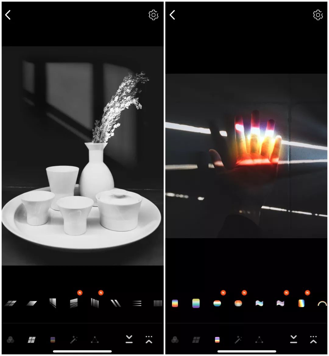 而至于画面那些 bling bling 彩虹光斑,用 Colorow 就可以后期添加。这款 App 内置了许多逼真的光学效果,除了能够细腻地模拟各式彩虹光,还有阳光透过窗户的光线、透过树叶的斑驳等特效。这一点点特效的添加,能够改变整个画面的布光,甚至观感上已经完全不同于原本的拍摄场景了,如果能够合理地运用 Colorow,肯定能够为照片增色不少。