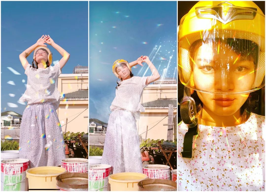 她的气质也深深地体现在她的照片中——阳光充足、颜色饱满、表情搞怪,还时常带有那各式彩虹光斑,给人一种莫名灵性的感觉。她本人在微博上曾解答过粉丝的问题,分享了自己使用的滤镜 app——GirlsCam。这是一款号称能让男生用了都自称小仙女的 app,它和一般的美颜自拍类 app 不同的地方大概是独家的滤镜和粉嫩的贴纸吧,所以深受苏运莹喜爱。