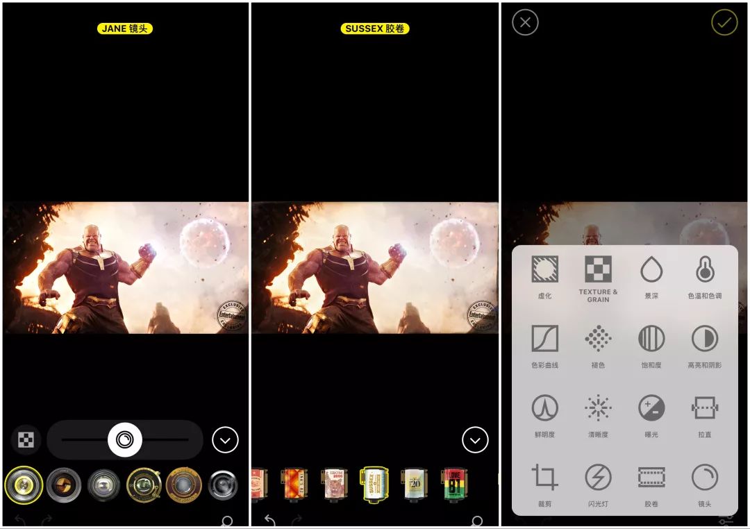 而在后期,Hipstamatic 没有「滤镜」这一概念,取而代之的是「镜头」与「胶卷」的无数种组合。除此之外,app 中的编辑工具也十分强大,除了基本的曝光、对比度、饱和度等,还有颗粒纹理、曲线等工具,可以说是一应俱全了。