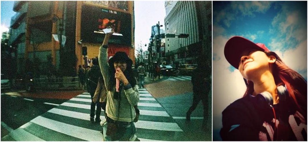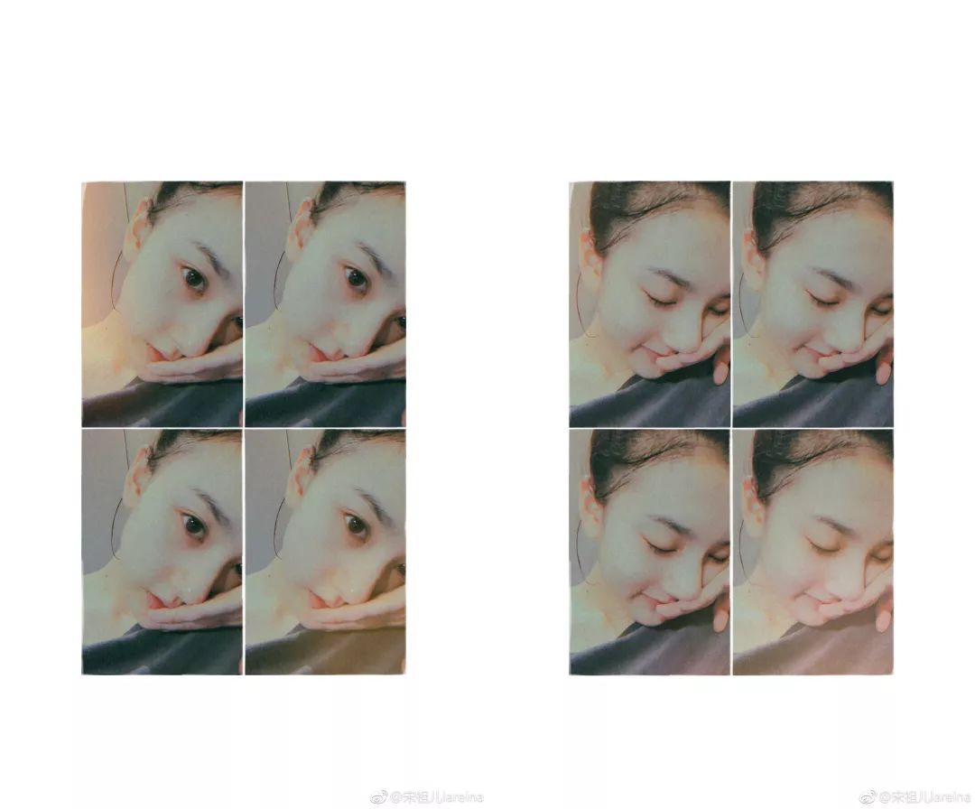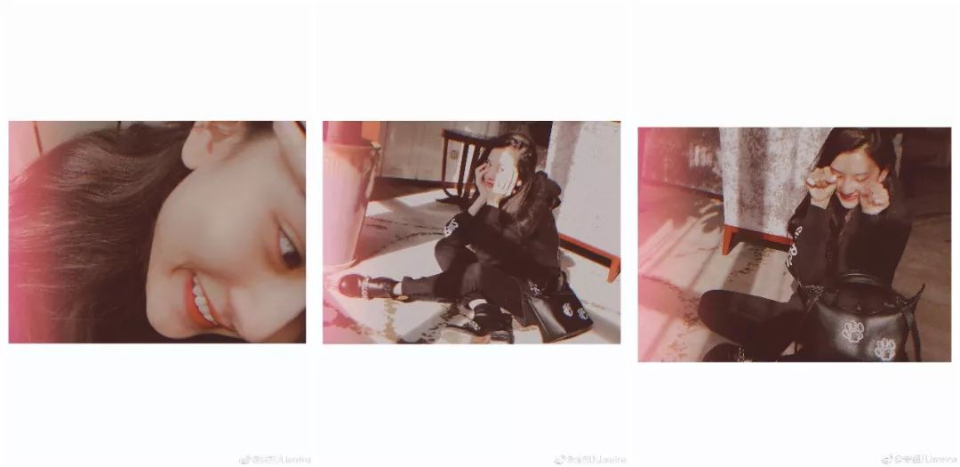 而她的自拍也十分俏丽,虽然用的是烂大街的 B612,但却拍出了不一样的感觉——复古胶片风滤镜、迷幻的漏光特效,再加上一个大留白的边框,虽然很「网红」,但是与少女气息相得益彰。同款自拍特效可以在 B612 「贴纸」中的拼图特效里找到。
