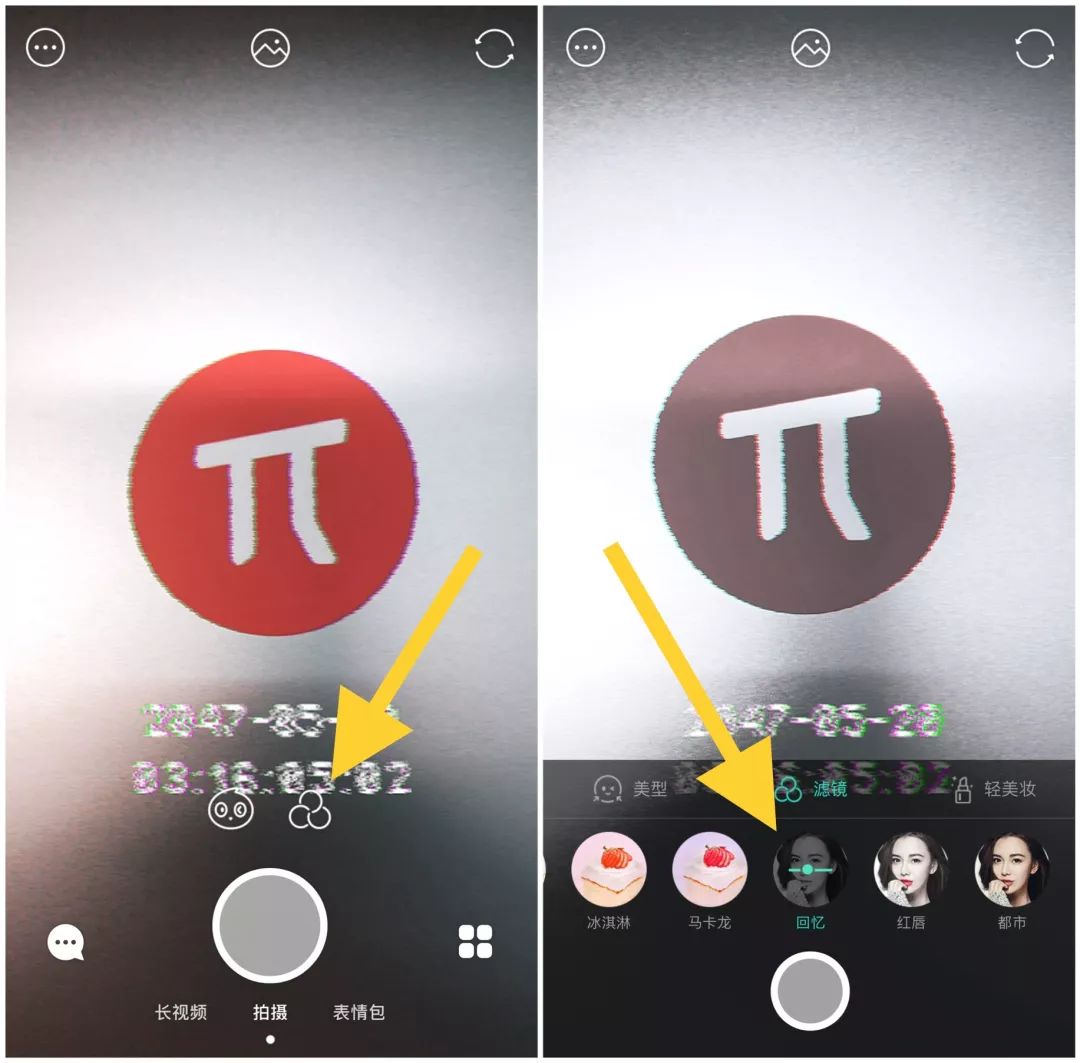 而这个特效本身是不带黑白效果的,所以我们还需要在「滤镜」中切换成「回忆」滤镜,这样就大功告成了。
