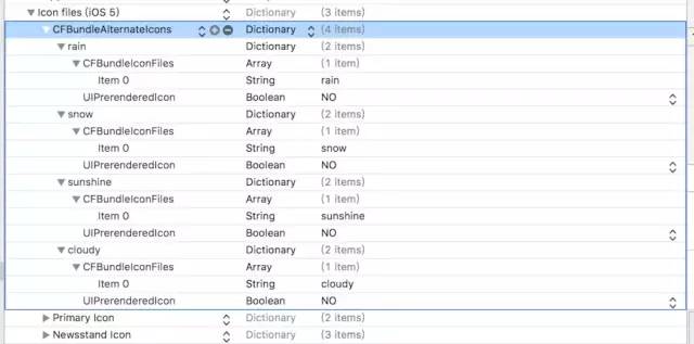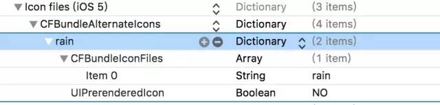 在 Icon files(iOS 5)内添加一个Key: CFBundleAlternateIcons ,类型为字典,在这个字典里配置我们所有需要动态修改的icon:键为icon的名称,值为一个字典(这个字典里包含两个键:CFBundleIconFiles,其值类型为Array,内容为icon的名称;UIPrerenderedIcon,其值类型为bool,内容为NO,也可以不加此key),例如: