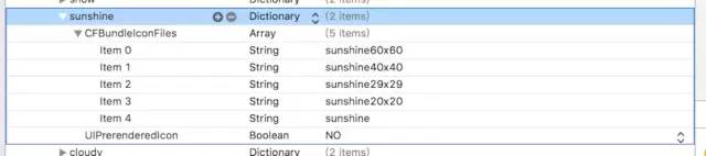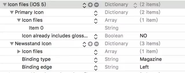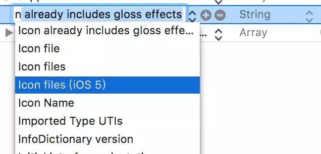 这里的Icon files(iOS 5)是个字典,其中可包含的Key值有CFBundlePrimaryIcon -> Primary Icon